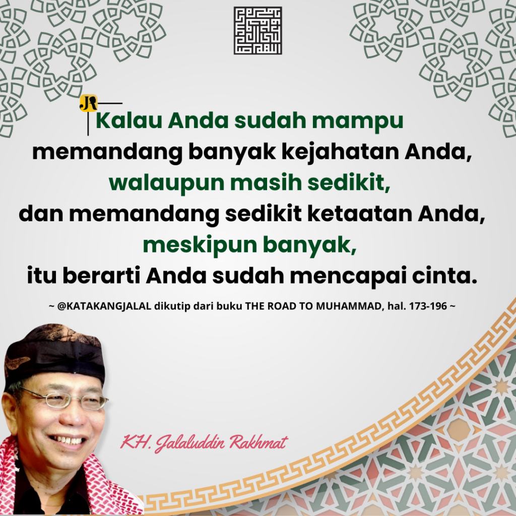Jadi, kalau Anda sudah mampu memandang banyak kejahatan Anda, walaupun masih sedikit, dan memandang sedikit ketaatan Anda, meskipun banyak, itu berarti Anda sudah mencapai cinta. Contoh konkretnya, apabila Anda sudah merasa banyak mengeluarkan infak, Anda belum mencintai Tuhan. Imam Ali Zainal Abidin sering dimintai bantuan oleh orang. Setiap kali orang datang meminta tolong kepadanya, Ali Zainal Abidin berkata, “Selamat datang sahabat yang akan menolong memikulkan bekalku di hari akhirat! (marhaban liman yahmil zâdi ilâl akhirah).” Beliau menganggap orang yang meminta bantuan itu sebagai kuli yang memikulkan beban perbekalannya di akhirat. Karena itu, setiap orang yang datang meminta tolong kepadanya, beliau sambut dengan wajah yang cerah.