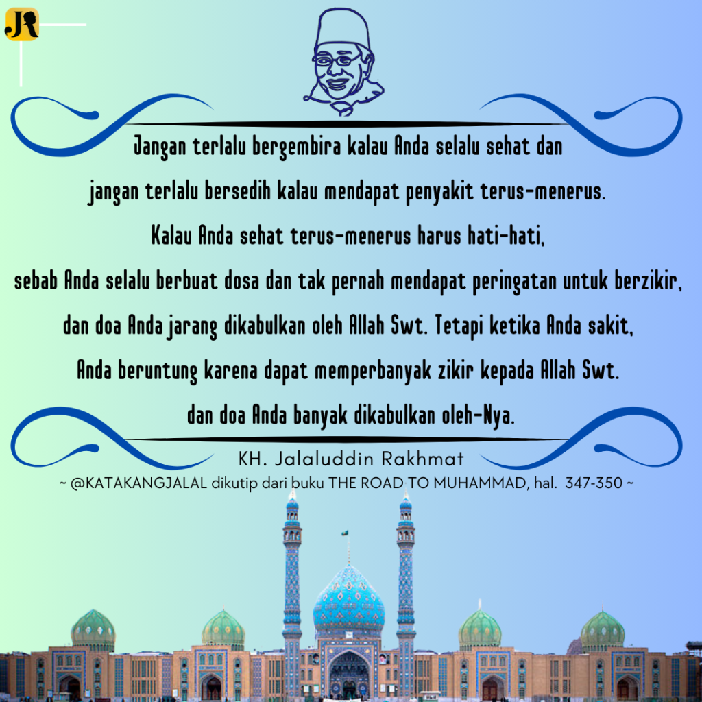 Oleh karena itu jangan terlalu bergembira kalau Anda selalu sehat dan jangan terlalu bersedih kalau mendapat penyakit terus-menerus. Kalau Anda sehat terus-menerus harus hati-hati, sebab Anda selalu berbuat dosa dan tak pernah mendapat peringatan untuk berzikir, dan doa Anda jarang dikabulkan oleh Allah Swt. Tetapi ketika Anda sakit, Anda beruntung karena dapat memperbanyak zikir kepada Allah Swt. dan doa Anda banyak dikabulkan oleh-Nya. JR Wa mā taufīqī illā billāh, ‘alaihi tawakkaltu wa ilaihi unīb