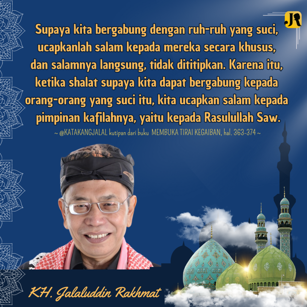 Supaya kita bergabung dengan ruh-ruh yang suci, ucapkanlah salam kepada mereka secara khusus, dan salamnya langsung, tidak dititipkan. Karena itu, ketika shalat supaya kita dapat bergabung kepada orang-orang yang suci itu, kita ucapkan salam kepada pimpinan kafilahnya, yaitu kepada Rasulullah Saw. “Assalamu ‘alayka ayyuhan nabiyyu wa rahmatullahi wa barakatuh,” Dan kita tidak mengucapkan, “Assalamu ‘alayhi.”
