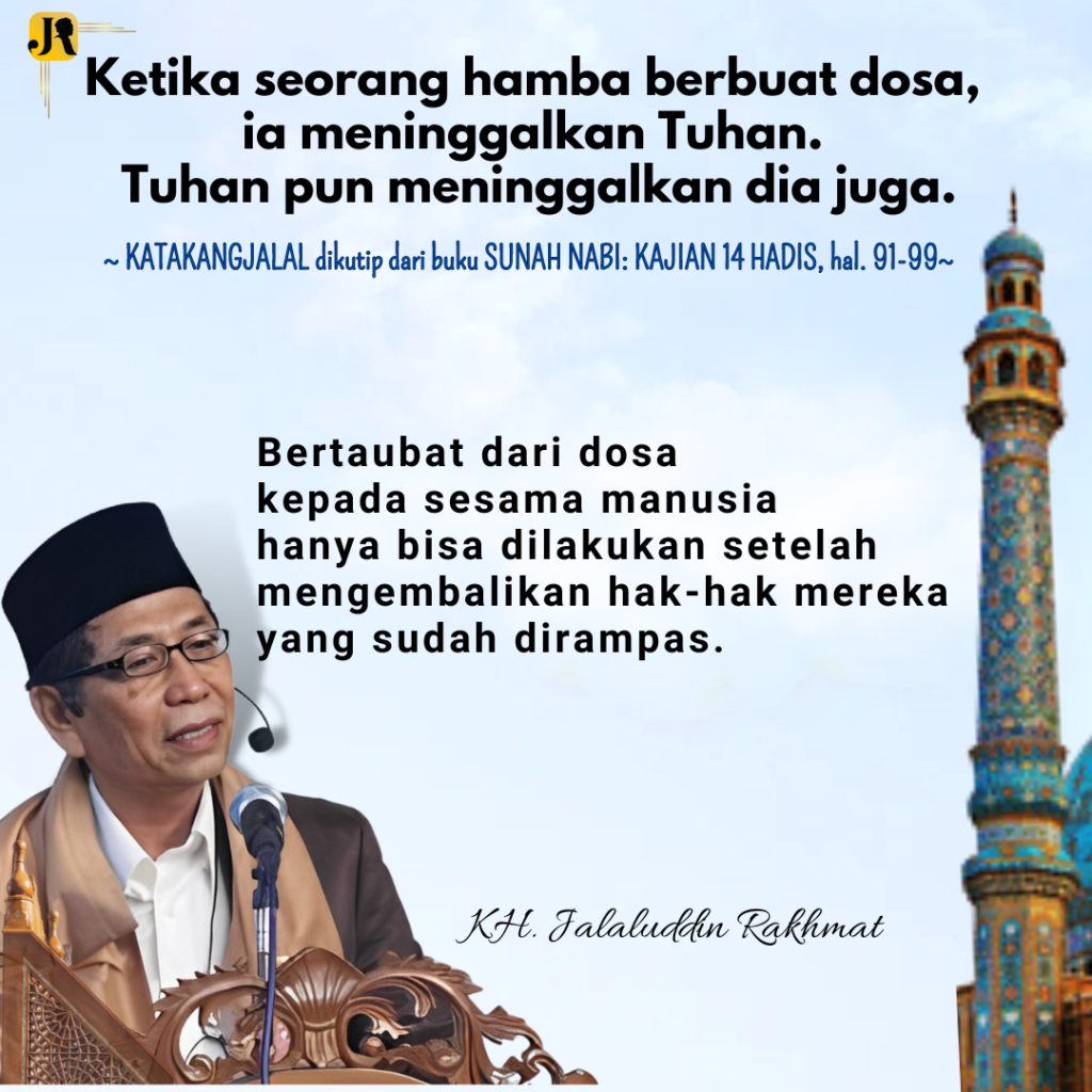 Ketika seorang hamba berbuat dosa, ia meninggalkan Tuhan. Tuhan pun meninggalkan dia juga. Seperti didendangkan Bimbo: “Aku dekat Engkat dekat. Aku jauh Engkau jauh”. Walaupun, berdasarkan hadis di atas, kalimat yang benar ialah “aku dekat Engkau lebih dekat lagi, aku jauh Engkau lebih jauh lagi”. Dalam salah satu hadis Qudsi yang masyhur, Tuhan berfirman: “Jika kamu datang kepadaku dengan merangkak, Aku akan menyongsongmu sambil berjalan. Jika kamu datang kepada-Ku dengan berjalan, Aku akan menyambutmu sambil berlari, karena kasih-Nya yang tidak terbatas. Betapapun besar dosa yang dilakukan seorang manusia, Tuhan akan selalu menerima hamba-Nya yang kembali kepada-Nya.