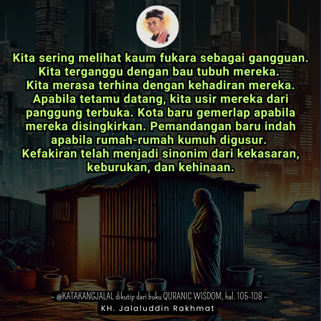Seperti para pembesar Quraisy, kita sering melihat kaum fukara sebagai gangguan. Kita terganggu dengan bau tubuh mereka. Kita merasa terhina dengan kehadiran mereka. Apabila tetamu datang, kita usir mereka dari panggung terbuka. Kota baru gemerlap apabila mereka disingkirkan. Pemandangan baru indah apabila rumah-rumah kumuh digusur. Kefakiran telah menjadi sinonim dari kekasaran, keburukan, dan kehinaan.