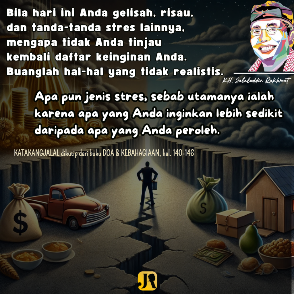 Bukankah Anda menjadi gelisah hanya karena orang lain mempunyai kekayaan yang tidak Anda miliki? Bukankah Anda menjadi sedih hanya karena rekan-rekan Anda mendapatkan sesuatu yang tidak Anda peroleh? Anda kemudian dipacu untuk menjadi seperti orang lain. Anda sudah kehilangan diri Anda. Anda ingin menjadi orang lain. Anda mengalami stres. Anda tidak bisa mengatur apa yang diperoleh orang lain, tetapi Anda dapat mengendalikan apa yang Anda inginkan. Rasulullah pernah bersabda, “Yang disebut kaya bukankah karena banyak harta. Yang disebut kaya adalah kaya jiwa” (HR Bukhari dan Muslim dari Abu Hurairah).