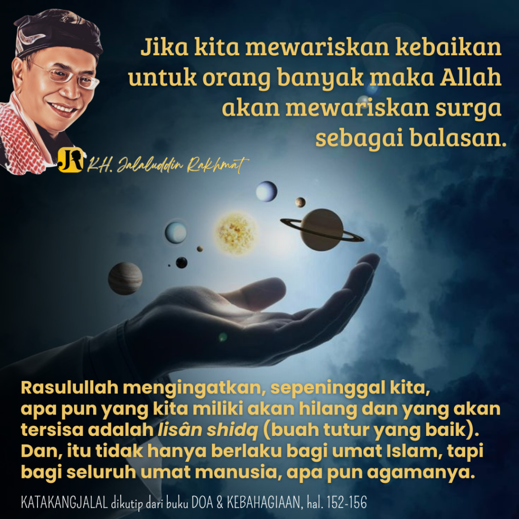 ISLAM mengisyaratkan agar keberadaan setiap kita menjadi kenangan indah bagi generasi sepeninggal kita. Rasulullah mengingatkan, sepeninggal kita, apa pun yang kita miliki akan hilang dan yang akan tersisa adalah lisân shidq (buah tutur yang baik). Dan, itu tidak hanya berlaku bagi umat Islam, tapi bagi seluruh umat manusia, apa pun agamanya. Sebab itu, dalam sabdanya, redaksi yang digunakan Rasulullah adalah “idzâ mâta ibn âdam …” atau “idzâ mâta ibn al-insân ...” atau “Jika manusia meninggal …”, dan bukan “idzâ mâta al-muslimûn” atau “Jika umat Islam meninggal …