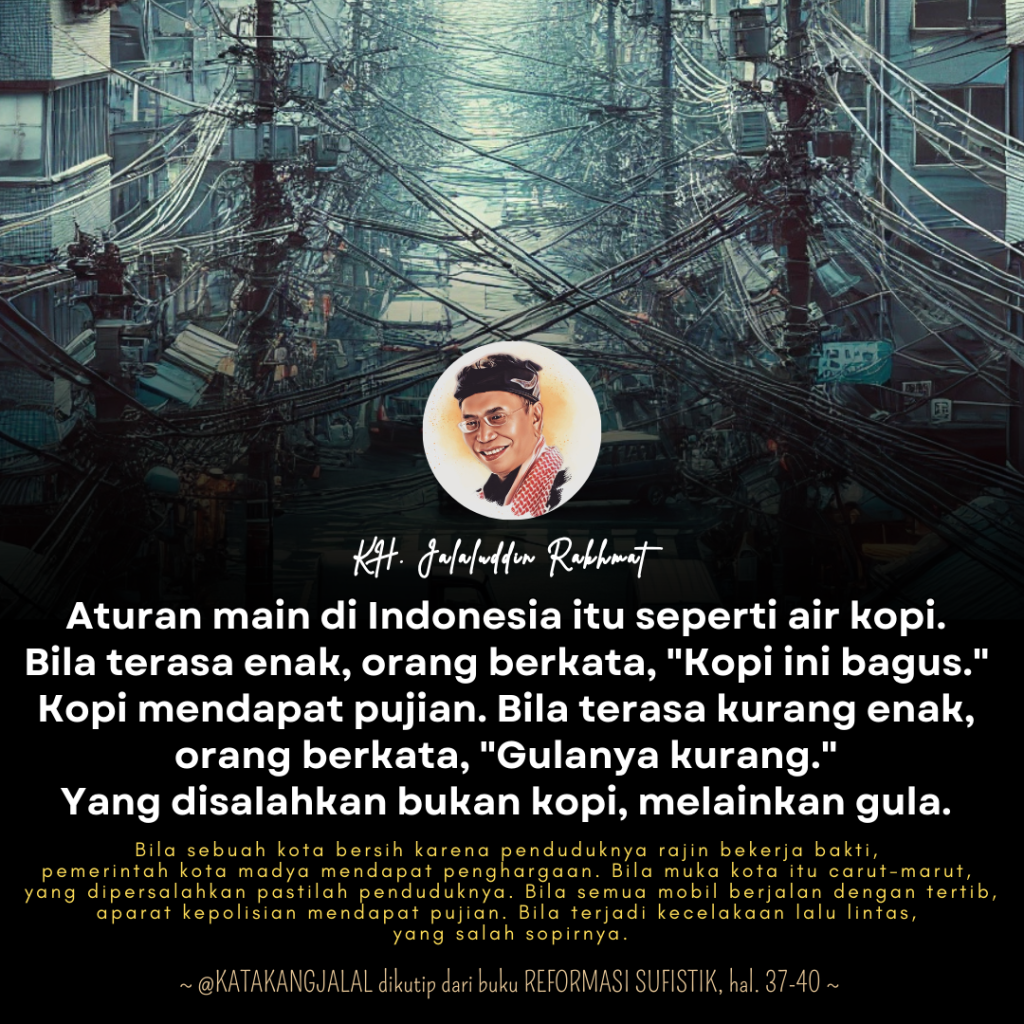 Aturan main di Indonesia itu seperti air kopi. Bila terasa enak, orang berkata, “Kopi ini bagus.” Kopi mendapat pujian. Bila terasa kurang enak, orang berkata, “Gulanya kurang.” Yang disalahkan bukan kopi, melainkan gula. Bila sebuah kota bersih karena penduduknya rajin bekerja bakti, pemerintah kota madya mendapat penghargaan. Bila muka kota itu carut-marut, yang dipersalahkan pastilah penduduknya. Bila semua mobil berjalan dengan tertib, aparat kepolisian mendapat pujian. Bila terjadi kecelakaan lalu lintas, yang salah sopirnya.
