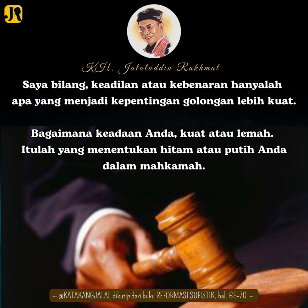 “Dengar, kalau begitu,” kata dia. “Saya bilang, keadilan atau kebenaran hanyalah apa yang menjadi kepentingan golongan lebih kuat. Sekarang mana pujianmu itu? Saya sudah lihat Anda akan membantah jawaban ini. Setiap jenis pemerintahan menjalankan hukum untuk kepentingan penguasa. Pada pemerintahan demokrasi, hukum demokratis; tirani, hukum tiranis, dan seterusnya. Dalam menetapkan hukum itu, mereka menetapkannya dengan jelas bahwa apa yang benar’ bagi rakyat adalah apa yang menjadi kepentingan penguasa. Siapa yang menyimpang dari sini dihukum sebagai pelanggar dan ‘penjahat.’ Inilah yang saya maksud bahwa ‘yang benar’ sama saja di semua negeri: kepentingan pemerintah berkuasa; dan pemerintah adalah unsur terkuat di setiap negeri. Jadi, kita berdalil dengan benar bahwa yang benar selalu sama: kepentingan pihak yang lebih kuat.” (Plato, Republik).