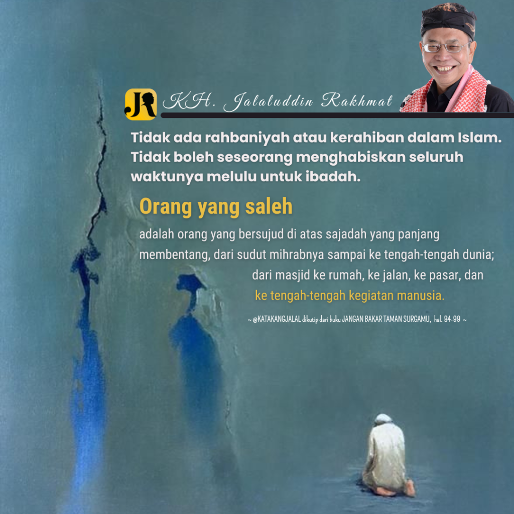 Tidak ada rahbaniyah atau kerahiban dalam Islam. Tidak boleh seseorang menghabiskan seluruh waktunya melulu untuk ibadah. Orang yang saleh adalah orang yang bersujud di atas sajadah yang panjang membentang, dari sudut mihrabnya sampai ke tengah-tengah dunia; dari masjid ke rumah, ke jalan, ke pasar, dan ke tengah-tengah kegiatan manusia.