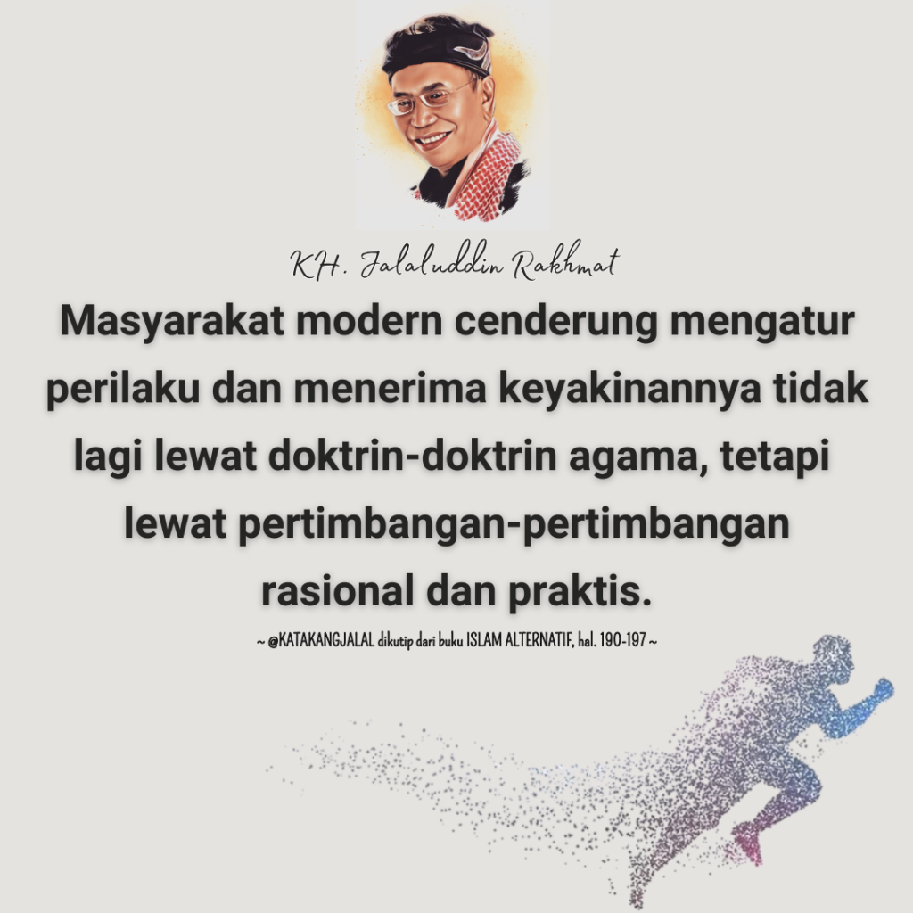 Implikasi kedua rasionalisme adalah sekularisasi. Tanpa bermaksud untuk terlibat dalam perdebatan tentang makna istilah ini, kita dapat menunjukkan —dengan meminjam penjelasan Larry Shiner, profesor agama di Sangamon University—bahwa sekularisasi, paling tidak, menunjukkan lima hal: mundurnya pengaruh agama, sekadar kompromi dengan dunia, demistifikasi atau desakralisasi dunia, ketidakterikatan (disengagement) kepada masyarakat, dan pemindahan kepercayaan/iman dan pola-pola perilaku dari suasana keagamaan ke suasana sekular. Yang paling tampak bagi masyarakat Islam adalah definisi terakhir. Masyarakat modern cenderung mengatur perilaku dan menerima keyakinannya tidak lagi lewat doktrin-doktrin agama, tetapi lewat pertimbangan-pertimbangan rasional dan praktis. Pragmatisme telah menyempitkan peranan agama sebagai pengatur perilaku. Seperti yang telah terjadi pada umat Nasrani, di kalangan masyarakat Islam pun telah timbul pemikiran bahwa agama Islam hanyalah ajaran moral. Al- Quran hanya merupakan kumpulan kaidah moral. Di luar itu, Islam harus menyerahkan pengaturan perilaku kepada lembaga sosial masyarakat modern. Di sini pun sekularisasi tidak bisa ditanggapi hanya dengan pendekatan emosional. Kritik terhadap paradigma sekular harus dikembangkan secara serius, dengan membongkar implikasi-implikasi kontradiktif di dalamnya (kalau ada). Di Barat, sekularisasi telah banyak dikritik. Di Inggris, David Martin membongkar premis-premis sekularisasi. Begitu pula Andrew Greeley dalam Unsecular Man, dan Harvey Cox dalam The Feast of Fools. Belakangan, kita boleh juga menunjuk orang-orang seperti Theodore Roszak, Martin Buber, Carl Rogers, Erich Fromm, Victor Frankl, Abraham Maslow, Teilhard de Chardin, dan lain-lain, yang lazim dikenal sebagai Konspirasi Aquarian. Di Indonesia, sekularisasi hanya sering menjadi isu temporer dan insidental, lebih bersifat politis daripada “pembangkit wawasan.”