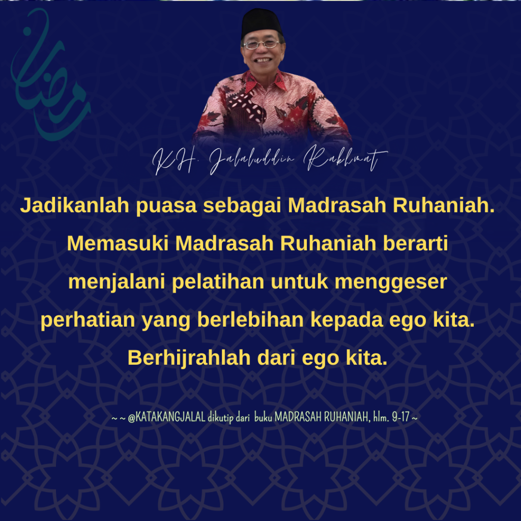 Jadikanlah puasa sebagai Madrasah Ruhaniah. Memasuki Madrasah Ruhaniah berarti menjalani pelatihan untuk menggeser perhatian yang berlebihan kepada ego kita. Berhijrahlah dari ego kita. “Berhijrahlah dari rumah kita yang sempit (ego), menuju Allah dan Rasul-Nya, “Rumah semesta yang tidak terhingga”.