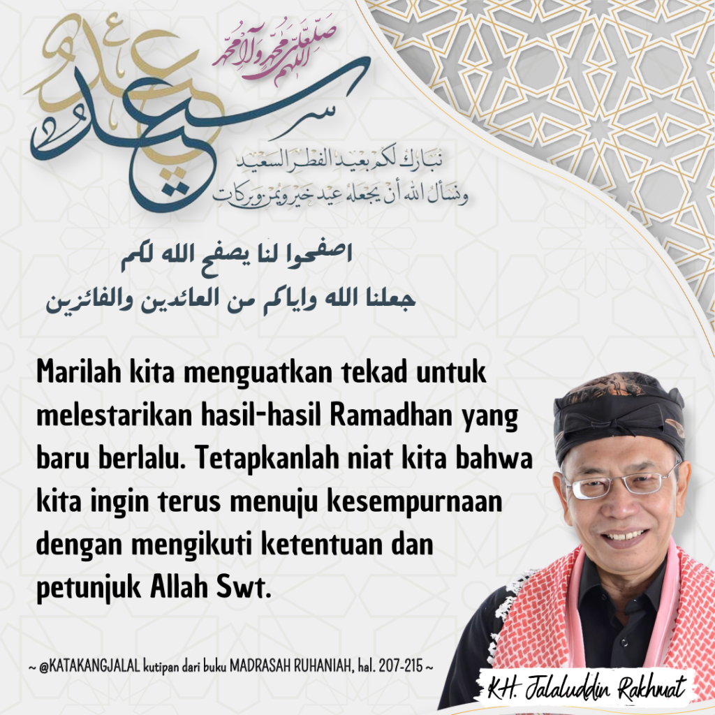 Setelah sebulan lamanya kita berusaha mendekatkan diri kepada Allah. Setelah kita mengurangi makan dan tidur untuk menaati ketentuan dan petunjuk Allah, kita akan diuji sampai Ramadhan yang akan datang. Apakah kita termasuk hamba-hamba Allah yang setia mengikuti ketentuan dan petunjuk-Nya, sehingga sedikit demi sedikit kita naik ke maqam yang lebih tinggi, setapak demi setapak kita mendekati Allah Yang Maha Mulia. Ataukah ruhani kita yang indah yang tumbuh subur di bulan Ramadhan yang dilukiskan Al-Quran seperti Al-Mar’a, rerumputan yang hijau, akan berubah menjadi, Ghutsaan Ahwa sampah yang hitam?