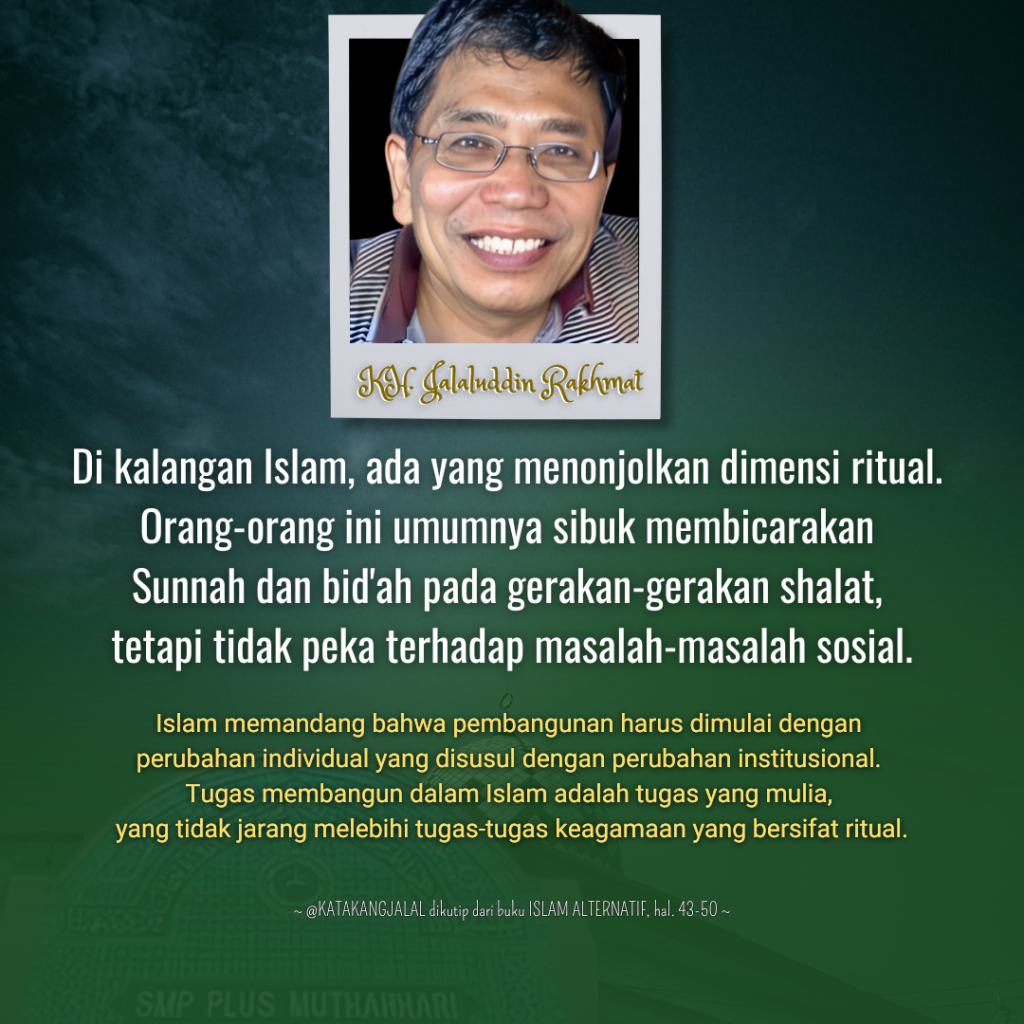 3. Islam memandang bahwa perubahan individual harus bermula dari peningkatan dimensi intelektual (pengenalan akan syariat Islam). kemudian dimensi ideologikal (berpegang pada kalimat tauhid). Dimensi ritual harus tecermin pada dimensi sosial. Dalam Islam, shalat selalu dihubungkan dengan kehidupan bermasyarakat; shalat harus mencegah fahsya dan mungkar (QS 29: 45); shalat selalu dikaitkan dengan zakat dalam banyak ayat Al-Quran; shalat diperintahkan bersamaan dengan perintah-perintah dalam kehidupan sosial (QS 70: 22-28; QS 107; QS 2: 83; dan sebagainya). Dalam beberapa hadis disebutkan bahwa ibadah yang tidak disertai dengan amal saleh dalam kehidupan sosial tidak diterima Allah. Mereka yang tidur dalam keadaan kenyang sementara tetangganya kelaparan, mereka yang shalat malam dan shaum tetapi menyakiti tetangganya, mereka yang beribadah tetapi merampas hak orang lain, dan sebagainya dinyatakan tidak melaksanakan agamanya. Kekurangan dalam ibadah ditebus (kifarat-nya) dengan menunjukkan amal saleh, seperti memberi makan orang miskin, tetapi cacat dalam kehidupan sosial tidak dapat ditebus dengan ibadah ritual. Saya berani mengatakan bahwa dimensi sosial ajaran Islam memperoleh proporsi yang jauh lebih besar daripada dimensi ritual atau mistikal.