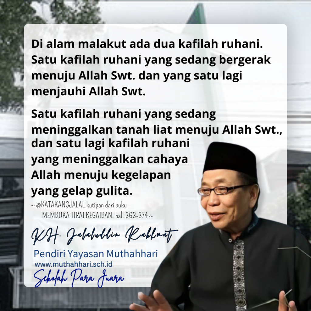 Di alam malakut ada dua kafilah ruhani. Satu kafilah ruhani yang sedang bergerak menuju Allah Swt. dan yang satu lagi menjauhi Allah Swt. Satu kafilah ruhani yang sedang meninggalkan tanah liat menuju Allah Swt., dan satu lagi kafilah ruhani yang meninggalkan cahaya Allah menuju kegelapan yang gelap gulita.