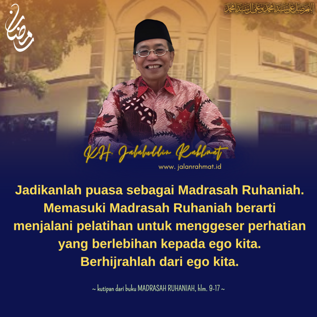 Jadikanlah puasa sebagai Madrasah Ruhaniah. Memasuki Madrasah Ruhaniah berarti menjalani pelatihan untuk menggeser perhatian yang berlebihan kepada ego kita. Berhijrahlah dari ego kita. “Berhijrahlah dari rumah kita yang sempit (ego), menuju Allah dan Rasul-Nya, “Rumah semesta yang tidak terhingga”.