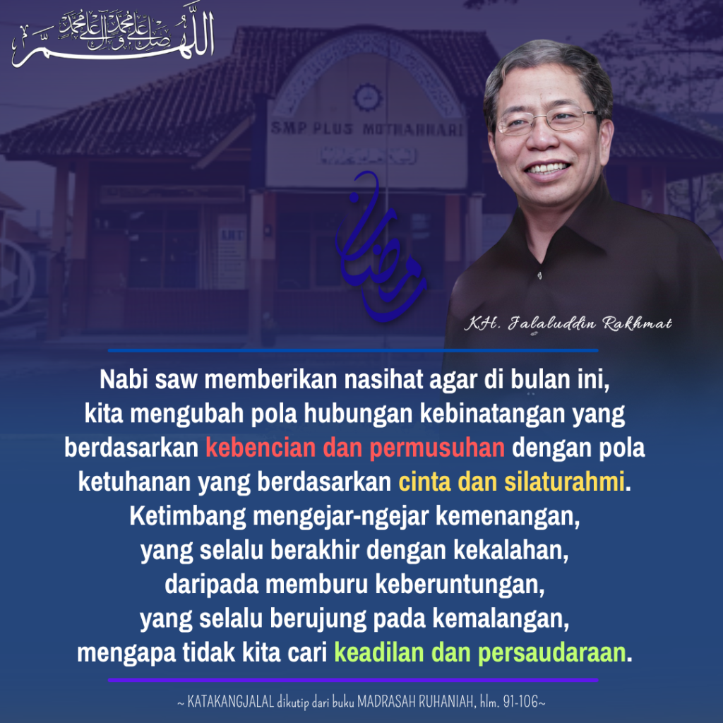 Ramadhan datang untuk memenangkan insan malakuti. Nabi saw memberikan nasihat agar di bulan ini kita mengubah pola hubungan kebinatangan yang berdasarkan kebencian dan permusuhan dengan pola ketuhanan yang berdasarkan cinta dan silaturahmi. Ketimbang mengejar-ngejar kemenangan, yang selalu berakhir dengan kekalahan, daripada memburu keberuntungan, yang selalu berujung pada kemalangan, mengapa tidak kita cari keadilan dan persaudaraan. Baik kepada rakyat kecil maupun para pembesar, Nabi berkata, “Bersedekahlah kepada fakir miskin. Muliakan para pemimpin kamu dan kasih-sayangi orang-orang kecil di antara kamu. Sambungkan persaudaraan kamu. Sayangilah anak-anak yatim orang lain supaya Tuhan menyayangi anak-anak yatim kamu.” JR